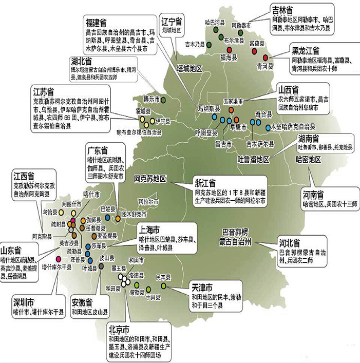 | 北京市: | 对口支援和田地区的和田市、和田县、墨玉县、洛浦县及新疆生产建设兵团农十四师团场 |